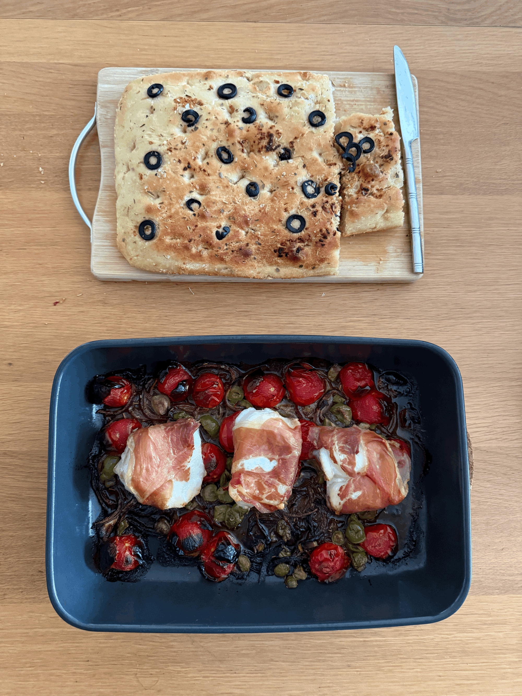 My Potato Dauphinoise, and focaccia bread with cod & cherry tomato traybake. Aishwarya's Strawberry Tiramisu.